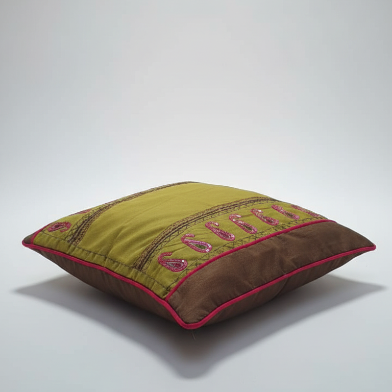 This luxurious Green Cushion Cover from the home accessories category features intricate Chamki work embroidery, showcasing exquisite craftsmanship. Made from premium silk fabric, it offers a smooth texture and elegant finish. The rich green color adds a vibrant and stylish touch, perfect for enhancing the decor of any living space.
