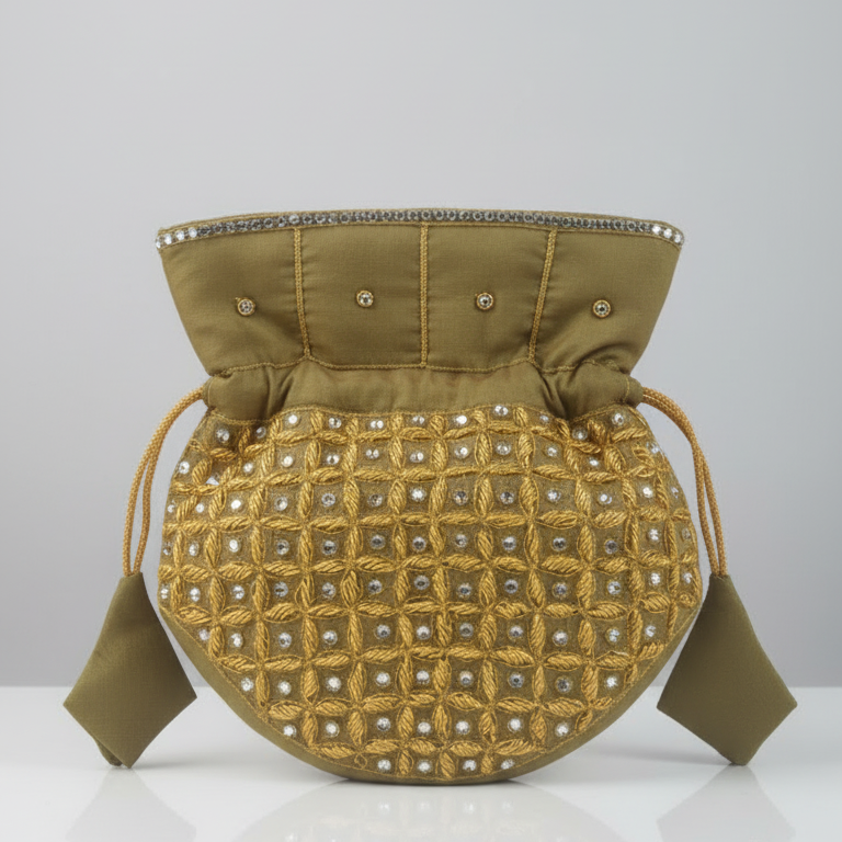 This stylish Green & Golden Round Batwa from the bags category is adorned with intricate embroidery work, showcasing elegant craftsmanship. Made from premium fabric, it offers durability with a refined finish. The vibrant green and golden colors add a festive and eye-catching touch, perfect for special occasions and celebrations.