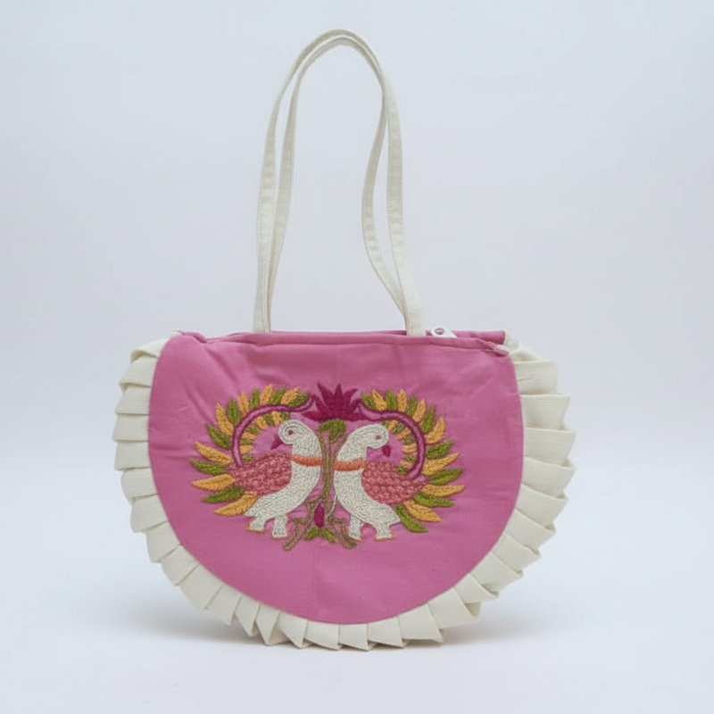This charming Pink & White Hand Bag from the bags category is adorned with delicate hand embroidery, showcasing traditional craftsmanship. Made from soft cotton fabric, it offers both style and durability. The subtle pink and white colors add a playful yet elegant touch, perfect for casual outings or festive occasions.
