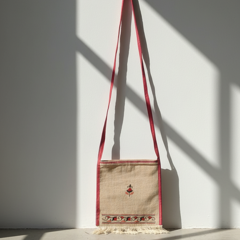 This vibrant Red Sling Bag from the bags category is crafted from sturdy jute material, offering durability and eco-friendly appeal. Featuring a handcrafted design, it adds a touch of artisanal charm. The bold red color makes it a stylish accessory for casual outings or daily use.