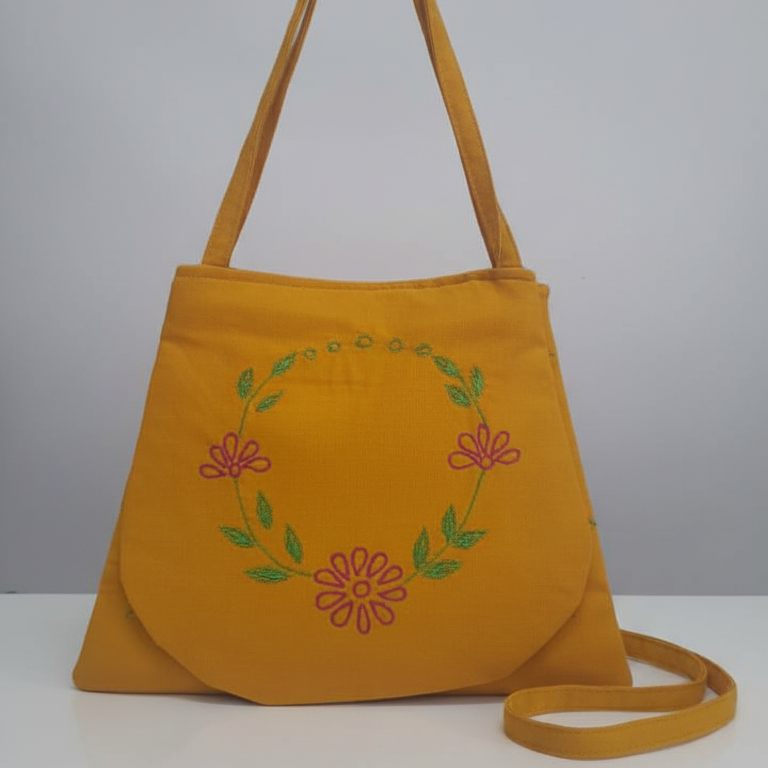 This vibrant Yellow Hand Bag from the bags category is adorned with delicate embroidery work, showcasing traditional craftsmanship. Made from soft cotton fabric, it offers both style and durability. The bright yellow color adds a cheerful and eye-catching touch, perfect for casual outings or festive occasions.